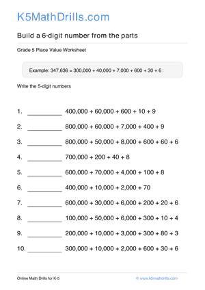 Practice place value 6 digit with this worksheet designed for fifth grade students.