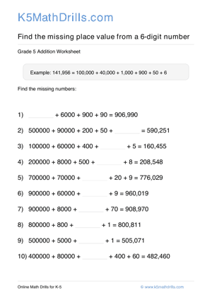 Practice place value missing 6 digit with this worksheet designed for fifth grade students.