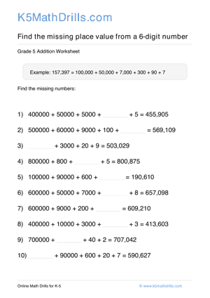 Practice place value missing 6 digit with this worksheet designed for fifth grade students.