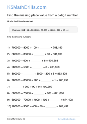 Practice place value missing 6 digit with this worksheet designed for fifth grade students.